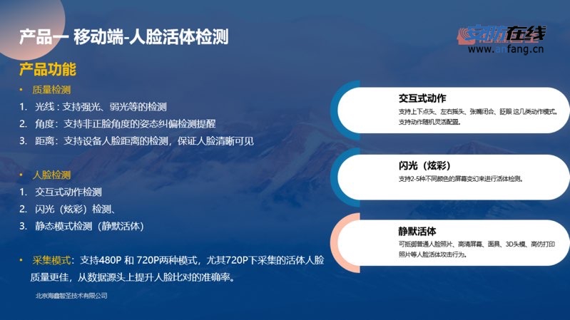 北京海鑫依托PAAS平台,为企业用户提供API形式的多生物识别检测服务,平台服务包括人像1V1比对、图片活体人脸检测、端+云人脸活体检查、H5人脸活体检测及身份证OCR识别。可根据您的业务环境选择APP方案接入或H5方案接入