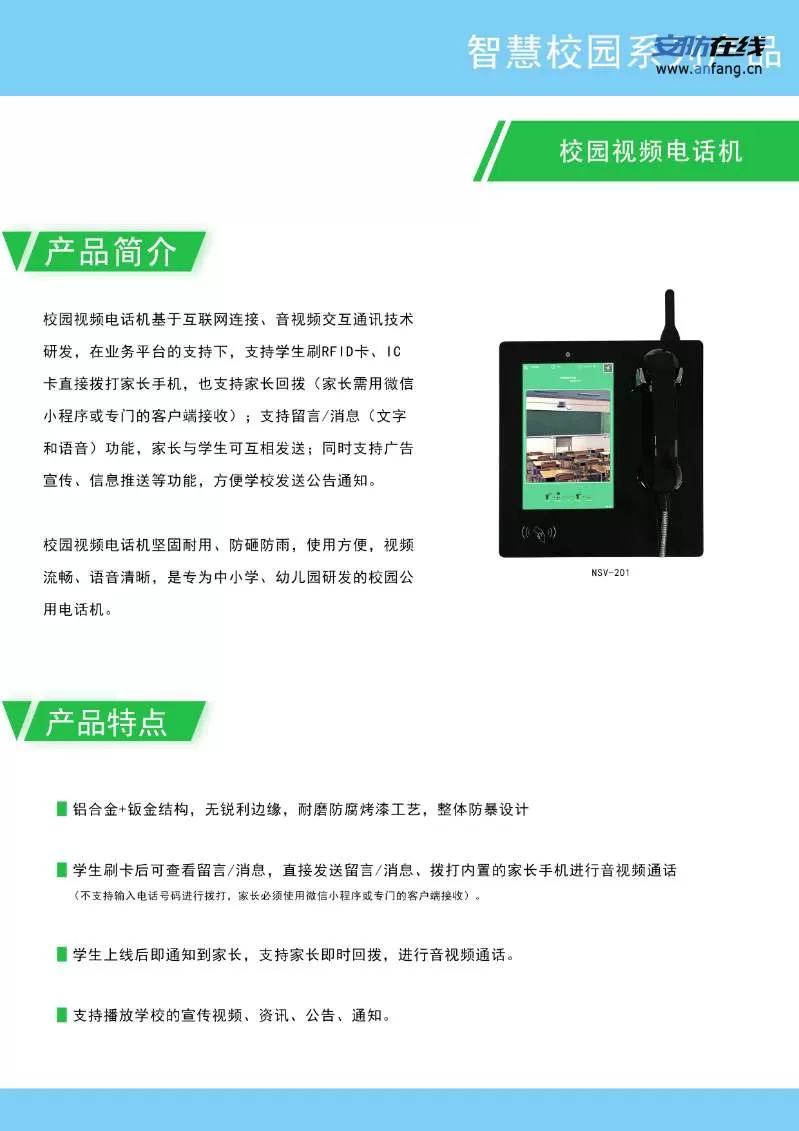 本话机使用方便、语音清晰、坚固耐用,亲情号码、呼入限制和网管功能保证了校园电话的安全性,广泛地应用于广大中小学校园中。