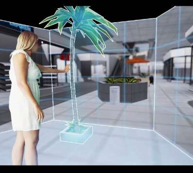 在一个面积20平方米的立体空间,用户在全息室内可以自由行走、360°浏览场景、轻松互动、编辑设计等。人与三维图像完全融为一体,创造临场感极强的空间互动体验。