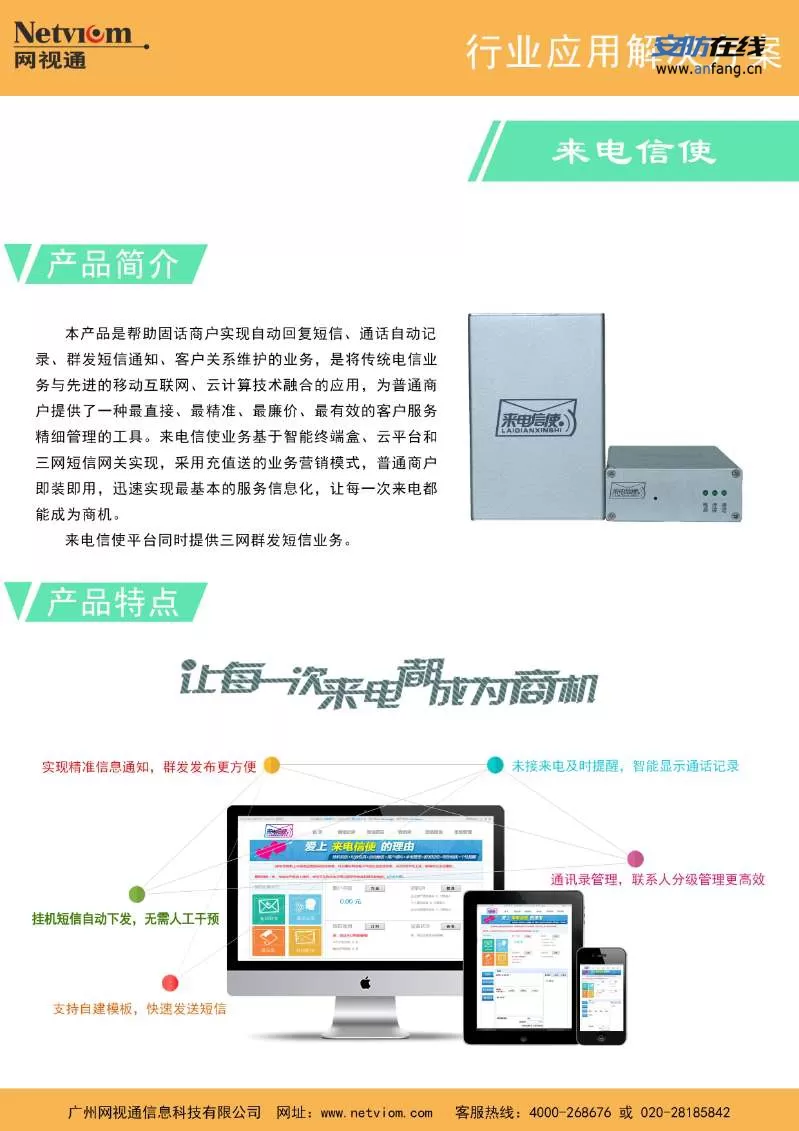 本业务基于云平台,可帮助企事业单位群发短信,并支持固话接到手机来电后自动发送短信,并保存通话记录,协助实现客户通讯录管理;