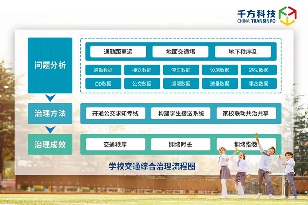 在浙江杭州,奥体实验小学由于上下学造成的瞬时交通流聚集引发学校周边交通拥堵和秩序混乱问题,千方科技“对症下药”,应用学校交通综合治理解决方案进行治理后,公交出行分担率达到62.6%,有效减少了机动车接送,学校周边道路早晚高峰平均拥堵指数下降至1.45以下。