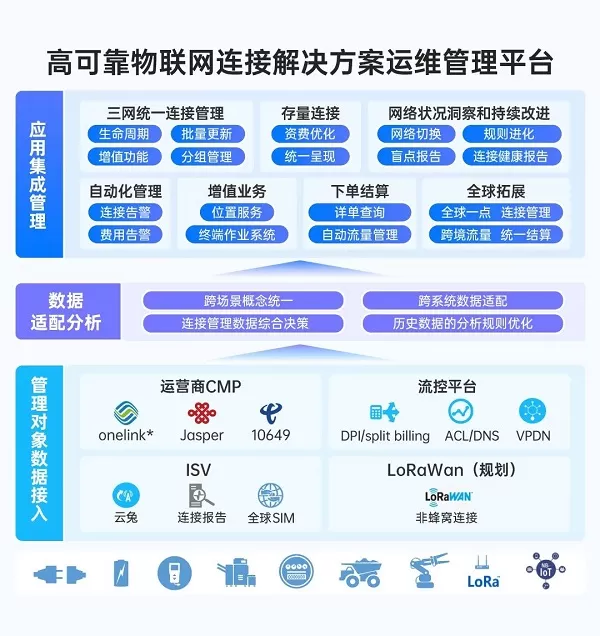 方案涵盖硬件实体卡、软件开发工具包(SDK)及连接管理平台,最高可将物联网设备网络可用性提升至99.999%。方案具有高稳定可靠网络、智能选取最优网络、网络故障自主切换、自动运维管理四大核心优势。