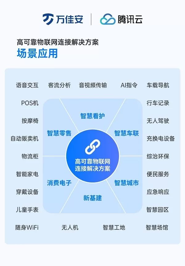 因此,万佳安与腾讯云兔强强联合,推出高可靠物联网连接解决方案,集成三大运营商网络通信能力,让企业用户以更少的成本获得更高可用、高安全、高稳定的网络连接服务。