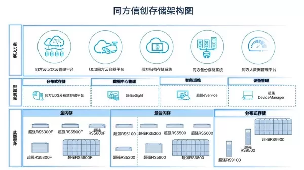 同方软硬件一体的信息系统体系与“云智大物移”新一代技术深度融合,从底层存储服务器到私有云平台、分布式存储平台,到数据归档、备份管理等上层应用,已完成整体适配及整合,进而推出软硬一体化信创云存储解决方案,核心应用的产品为:同方超强RS系列存储服务器、同方UDS分布式存储系统、同方归档存储系统、同方备份存储系统等。