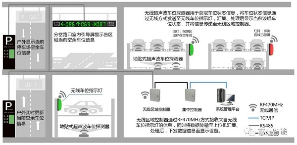 集中控制器汇集无线区域控制器所有数据并进行处理后,将数据传送至系统管理平台,并实时更新室内车位引导屏及入口剩余车位总览屏所显示的剩余车位数量,从而引导车辆快速进入空车位。