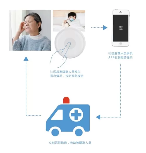 当居家隔离人员在隔离期间出现病症恶化等紧急情况时,可按动紧急按钮一键呼叫,社区监管人员会第一时间收到告警信息,对其进行及时救助,避免意外发生。