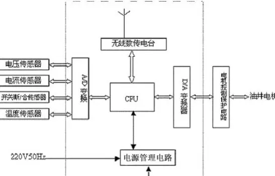 油井工作状态传感器主要有温度传感器,电压传感器,电机电流传感器,被监控开关断/合传感器,它们将油井的工作状态变换成对应的电压或电流值送至远程智能无线RTU。本系统留有扩展接口,可根据油井实际现场控制情况进行增加。