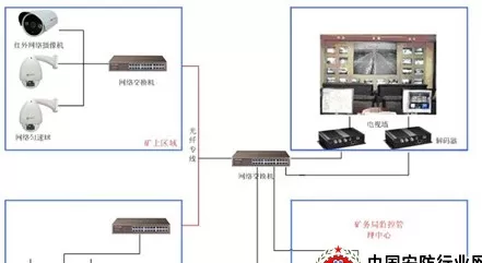 从网络监控系统可以看出,整体方案分为二部分,矿厂监控部分和矿务局监控部分。矿厂监控部分为矿上和矿下,系统前端由红外网络摄像机、网络匀速球和防爆型网络摄像机组成,后端由管理服务器、存储服务器、解码器和电视墙组成,前端和后端通过光纤和超5类双绞线传输到后端管理服务器,管理服务器安装视频管理软件,通过观看视频监控可以及时了解危险状况,采取相应措施,同时还可以启到治安管理的作用;矿务局监控,可以及时了解矿区的作业情况,发现险情可以第一时间通知现场并做出相应处理,同时还可对视频进行录像,一旦有险情发生,可随时调出录像,为事情的处理提供第一手材料。