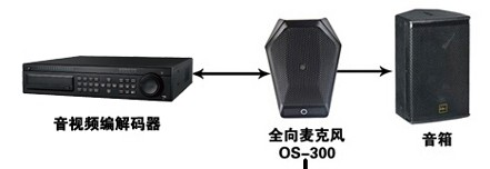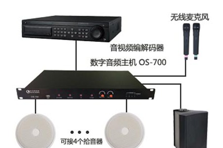 由于异地端多角度拾音器混路输出,所以需经过OS-700数字音频主机,针对于采集声源进行混路编码和双工过程中反馈音源的回音消除等进行计算处理。