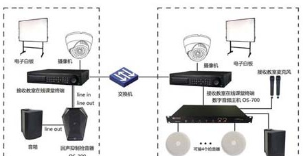 2、异地课堂:异地课堂配置KO-280高保真拾音器进行全向拾音(可吸顶式安装),连接于OS-700数字音频主机进行混路输出和反馈音源的回音消除等技术处理(OS-700端可直连音箱和无线话筒)。