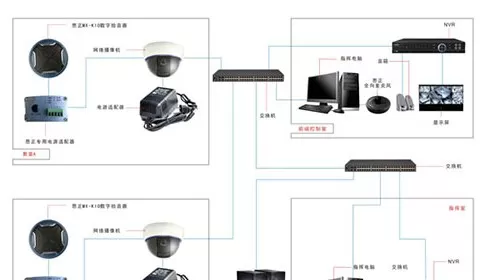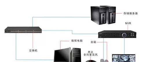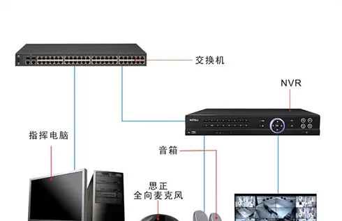市局指挥中心:通过交换机将前端多间教室监控设备采集的音视频接入硬盘录像机(NVR)输出至电视墙与音箱设备。监控中心工作人员可通过显示器上的画面随时切换监控任何一间教室的现场情况。确保考试现场的公开性与公正性。通过交换机市局指挥中心还可将前端传输的信号存储至专用的服务器中方便然后采证所有。同时通过交换机市局指挥中心还可配备一部电脑,电脑上安装一个思正全向麦克风,市局领导可通过全向麦克风随时指挥前端监控中心的工作人员,调配工作。