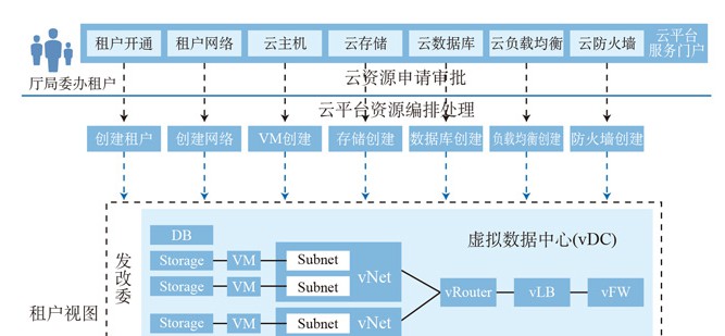 1、云服务门户: 提供服务目录,包括云主机、云存储、云数据库、云负载均衡、云安全等服务,以及相应的开户、租户网络等;各厅局委办租户用户可以根据业务应用的部署需要,在此门户上选择相应的服务项进行申请审批。审批之后自动生成相应资源。