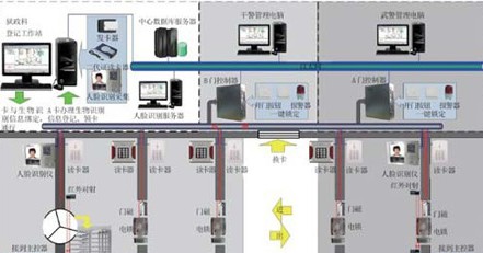 A、B两组门分别由两套控制器控制、A组武警看管、B组民警看管,各需A、B两种卡验证通行;卡片可自由选择ID、IC、CPU卡,本方案推荐安全度较高的IC卡,进出人员需刷卡或刷卡+密码;可在任意通道门的外出方向安装安全系数更高的生物识别设备,如面相识别器、掌形仪等,对外出人员进行生物特征识别。