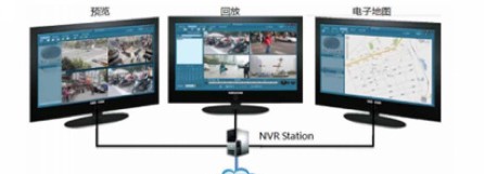 该系列NVR支持客户端的一机三屏功能,用户只需要一台电脑就可以快速构建一个低成本的监控中心,三个屏可分别显示不同的内容,没有复杂的连线,成本低,操作也非常简单直观。在实际使用过程中,用户可在三个屏幕上同时预览操作,也可任选一屏录像回放或任选一屏显示电子地图。在电子地图上还支持报警联动应用,当某个监控点发生告警时,电子地图可在对应位置弹出图像预览窗口发出提示,点击后可显示大画面监控视频。