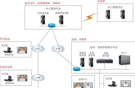 在省级司法单位(司法厅/监狱管理局/劳教局)部署探视预约调度平台、在监狱(劳教所)部署远程探视监控管理及视讯平台,在监狱(劳教所)、市司法局、区县司法局远程探视会见室各部署一台视频通信终端,后续根据业务需求扩展部署到基层司法所。