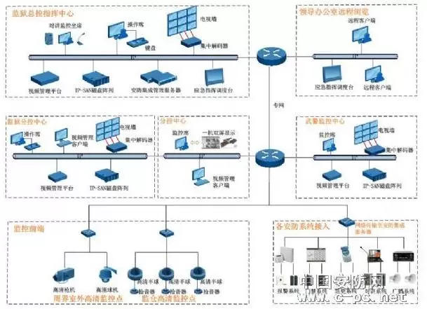 根据需求情况,系统采用二级联网方式,监狱总控中心为一级监控中心,实现全网管控和重要监控图像集中备份存储,各分控中心和武警监控中心为二级监控中心,负责辖区内资源管控和监控图像储存。