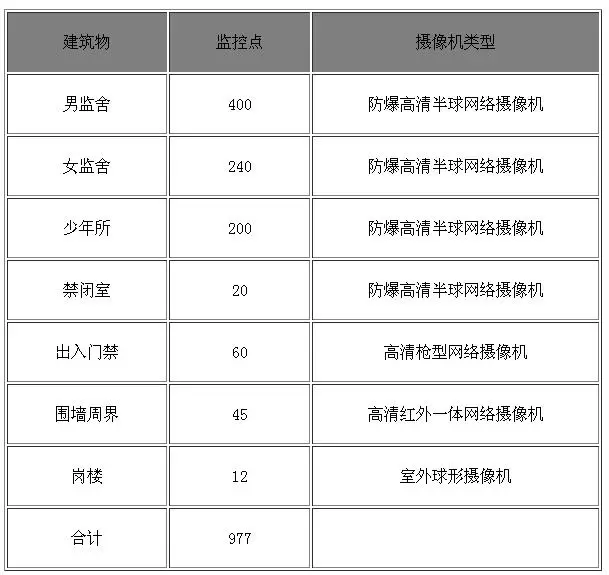 根据监狱的实际情况及相关要求,共分为男监舍200间,女监舍120间,少年监舍120间,围墙周界长3600米,针对这些区域的风险等级和现场实际情况,视频监控系统的前端按需求可分为3类:室外智能球型摄像机12套、室外高清红外枪型摄像机45套、高清枪型摄像机60套及室内防爆半球摄像机860套。