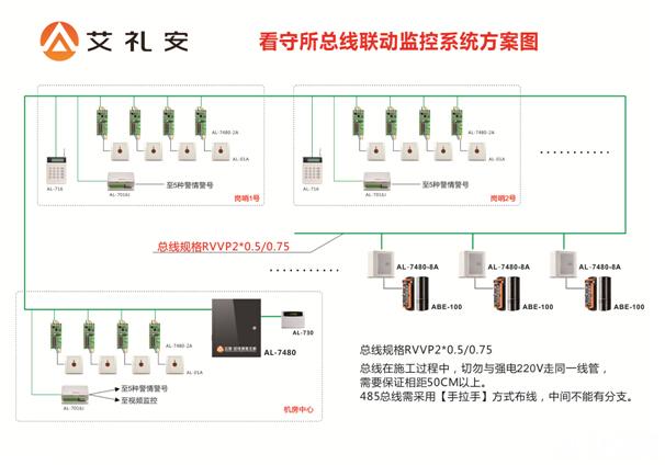 针对实际情况,艾礼安开发出了一套专门针对看守所的总线联动监控系统方案,将报警和监控有效地结合起来,保证看守所的安全运行。