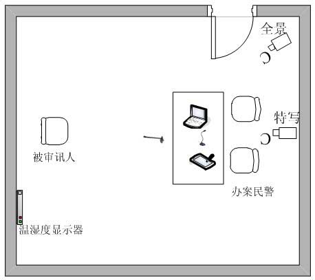 询问、讯问室:设置摄像机、拾音器、笔录电脑、时间温湿度显示器、审讯专用DVR。