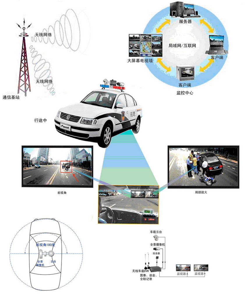 通过在公安执法车内安装操作键盘及车载电视等设备,可以通过车载硬盘录像机的本地环通输出的功能,在执法车内对车外的现场进行云台和镜头控制,观看角度可达360度。从而保证将最佳位置图像进行网络传输。