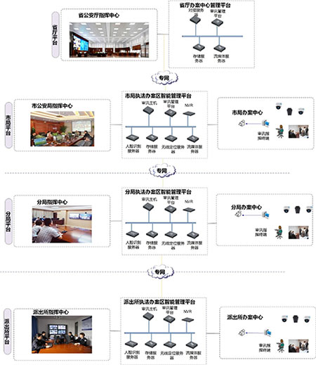 系统采用集中式部署、集中式管理的方式,通过执法办案区智能管理系统的多级级联可以实现省厅、市局、分局、派出所四级的大范围联网,统一调度,集中管理,既能够对全省公安局讯(询)问室及办案区进行统一协调管理,又能够实现远程指挥、多方会审等功能。