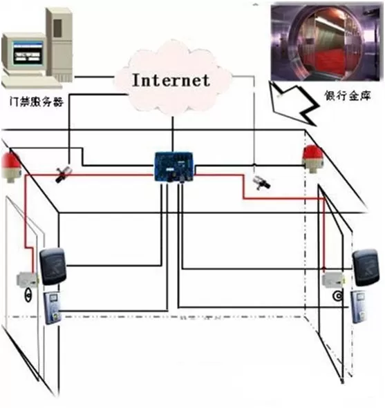 针对银行库区通道门,门禁系统可采用智能网络控制器,与生物识别、CPU读卡器(或手机读卡器)、电控锁、报警联动装置相连接,实现双门互锁,多重认证的方式,并实现自动报警、远程电话报警等方式,网络控制器能够脱机工作。针对银行银行金库门,必须有至少两个不同权限人的人员陪同共同刷卡才能开银行金库门,实现多卡开门功能。