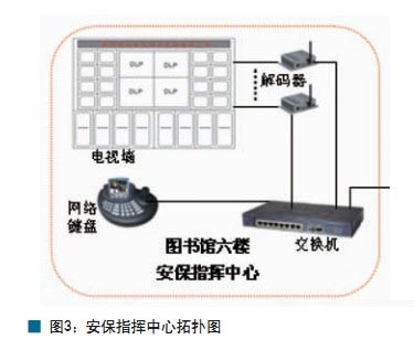 安保指挥中心利用金三立网络键盘可控制前端所有的摄像机、云台,并进行任意视频上墙。中心电视墙由24台金三立21寸、2台42寸监视器组成,为了方便扩充和管理,全部采用单路视频解码服务器。安保指挥中心拓扑图如图3。