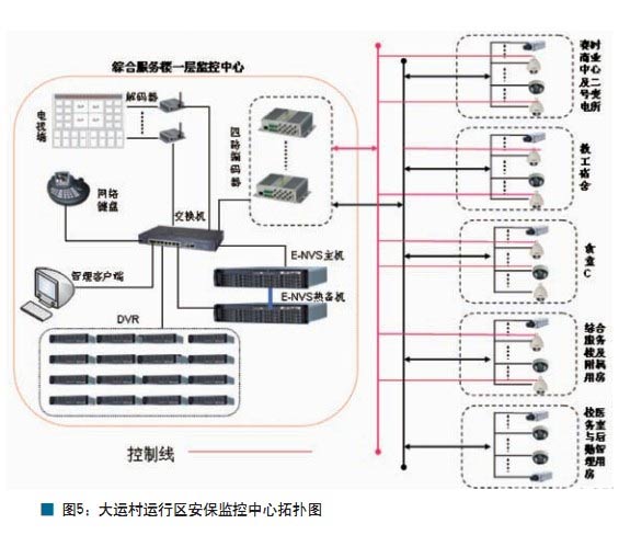 和以上指挥中心系统类似的是,其他分控中心,如体育场、体育馆、综合服务楼、学生公寓、教研楼等监控中心也都采用由网络平台、扩展存储NVR、网络键盘、管理客户端、单路解码器、电视墙等组成的整套监控系统,并通过接入前段摄像机,实时稳定的进行现场监控和管理。大运村运行区安保监控中心拓扑图如图5。