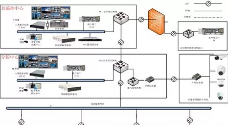目前大中型医院的规模,所需的监控点较多,为了能及时处理事件及履行专门的保安职责,整个系统设计为二级架构,即1个总控制中心和若干个分控制中心,各级间通过网络互联,这样既减少布线,又能集成为一个统一的管理系统。结构如下图: