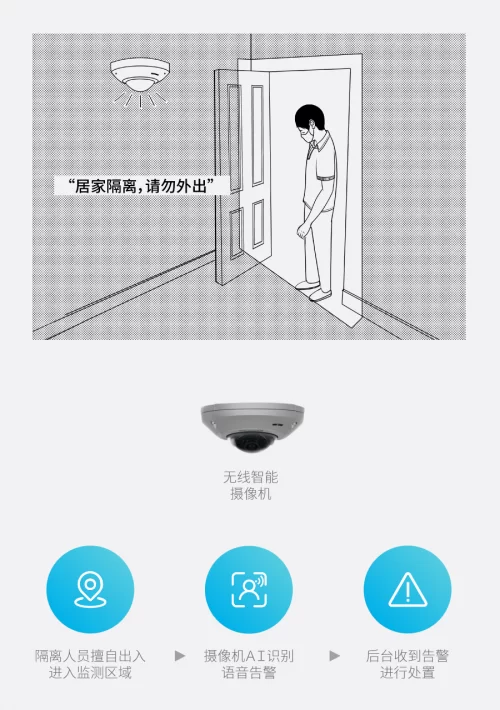 针对需要居家隔离的重点人员,科达提供轻便快捷易部署的无线智能摄像机部署方案,设备轻巧,仅需供电,搭配3M胶粘贴即可快速安装部署在重点人员门口,摄像机AI实现24小时隔离人员出入的人形检测及喊话告警,并将违规行为上报给相应管理人员以便及时处置。