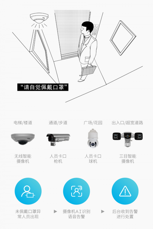 在电梯、楼道、小区花园、道路等公共区域内,科达全系列人员卡口摄像机AI识别未戴口罩人员,实时语音劝导,纠正危险行为。科达可提供无线半球、球机、枪机、三目摄像机等多种机型,满足小区各类场景的需要。