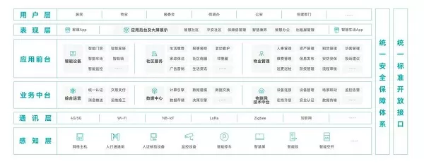平台将立林自主研发的社区、家居前端感知设备和丰富的第三方生态设备,通过4G/5G、WiFi、ZigBee、NB-IoT等通讯方式,接入拥有强大边缘计算能力的数据中心、AIoT平台和综合运营业务组成的业务中台,通过业务中台的能力实现智能设备、社区服务、物业管理等前台应用,最终面向不同用户群体(居民、物业、居委会、街道办、公安、住建部)提供不同的业务展现形式。