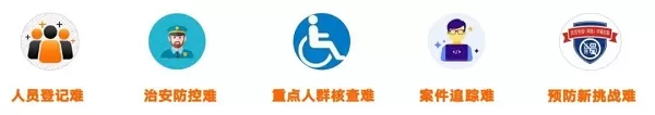 各城市均有大量流动人口,且大部分在工作地租房,对其管理存在5大难题:人员信息登记难、治安防控基本靠人力、重点人群(如刑满释放人员、吸毒人员、犯罪嫌疑人)监管难、案件追踪难、预防电信诈骗、地下赌场、毒品交易等新挑战难。