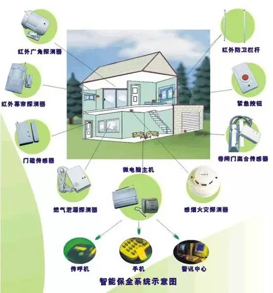 家庭安防。安全是居民对智能家居的首要要求,智能家居安防系统担负着保护居民的生命和财产安全的职责,家庭安防报警系统因此成为智能家居的首要组成部分。家庭安防报警系统包括:红外报警、门窗磁报警、紧急求助报警、燃气泄漏报警、火灾报警等。