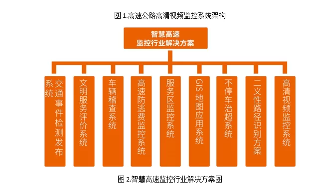 针对高速公路开发的整体解决方案:集高清视频监控系统、收费站出入口车牌识别系统、路径识别系统、服务器停车位管理系统、文明服务检测系统、交通事件检测系统等多个应用子系统于一体;