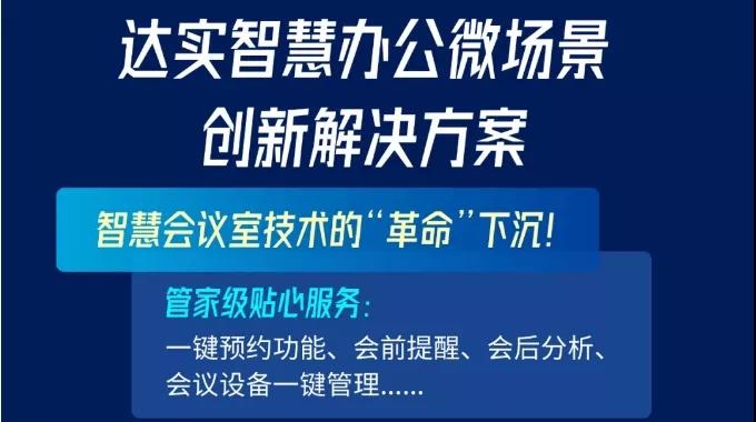 达实物联网会议室设备,内置人脸系统,集控门禁,空调,照明,窗帘等于一体,代替照明开关、空调面板、窗帘设备等,让墙面从此简洁一致,可以一键操作,调节会议室内的所有设备,并在会议结束后:一键开启离开模式,将自动关闭室内灯会议设备;如忘记关闭设备,会议室内人体存在传感器探测到无人后,可设置自动关闭设备;会议结束后设备仍然开启,也可以短消息通知控制室,会服人员可进行核实。