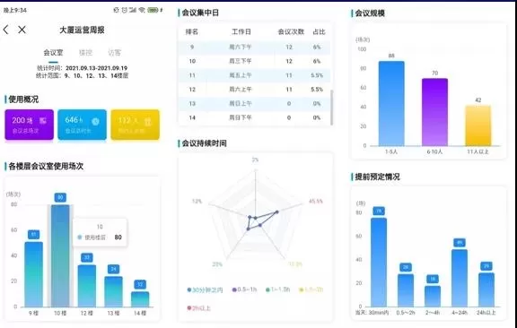 达实物联网会议系统,可实现企业每周/月/季/年对会议室的预约、使用等情况进行统计分析,从而制定更好的管理措施;如果会议室是经营性会议室,则可以根据运营情况调整经营策略。