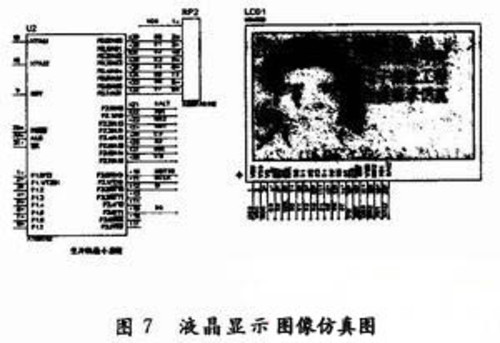 在Proteus里用LM4229代替设计中的TFT6448B芯片。仿真的目:用来获得图像显示的编码方式和液晶的单色位图显示功能。LM4229通过CDWRITEREAD三个引脚的电平来确定是读数据还是读状态,或者是写数据还是写命令。其数据引脚为8位,可以与单片机进行直接的数据交换,P2口为液晶显示的控制端,仿真结果如图7所示。