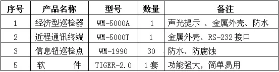附:可根据现场实际情况选择以上产品的数量,在感应器数量选择上,本着只要巡检人员能巡到就可以,并非越多越好。每一个地点对应使用一支感应器。经济型巡检器可每人选用一台,也可多人共用一台,在多人使用一支巡检器的情况下可使用人员钮来区分巡检人员。