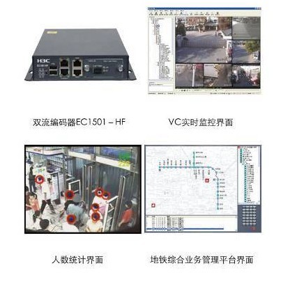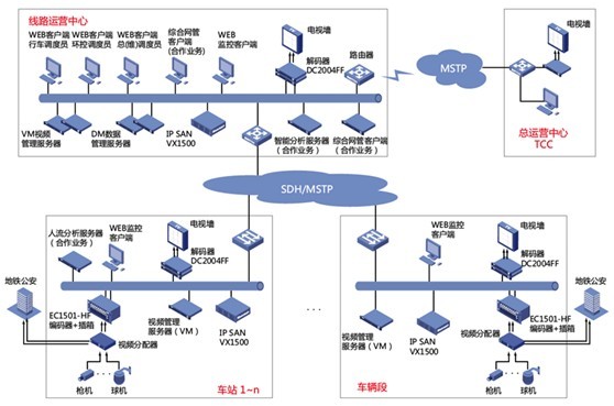 前端在车站前端利用分配器把前端的摄像机图像分一路给地铁公安监控,另外一路通过编码器EC系列传送到通信专用网络,编码器支持任意双流,实现图像清晰度和存储容量需求的平衡,车站一级的设备机房可以选择进行部署视频/数据管理服务器VM5000保证车站监控系统可独立运行,同时在车站部署IPSAN-VX1500,对车站内的图像进行保存,所有的存储流不上传到线路的监控中心,降低对专用通信传输网的带宽压力。
