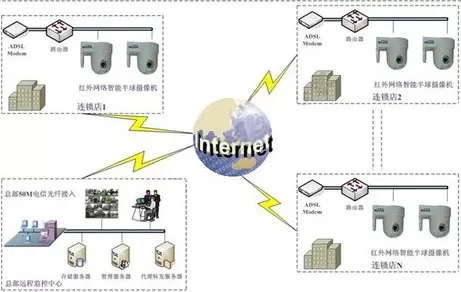 根据店铺现场实际情况,方案需使用现有的网络资源,同时借ADSL线路和公司光纤网进行网络数据传输,实现各级网络监控系统的全部功能。监控方案需在总公司设置总监控中心,使之成为一个网络监控站,可随意调看系统中任一店铺的任一画面。