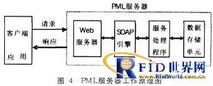 (3)ML服务器。PML服务器是由产品生产商建立并维护的产品信息服务器,它以标准的XML为基础,提供产品的详细信息,如产品名称、产品分类、生产厂家、生产日期、产品说明等。PML服务器的作用在于提供自动生成产品入库清单所需的产品详细信息,并允许通过产品EPC码对产品信息进行查询。PML服务器的工作原理如图4所示,它架构在一个Web服务器之上,服务处理程序将数据存储单元中的产品数据转换成标准的XML格式,并通过SOAP(简单对象访问协议)引擎向客户端提供服务,PML服务器的优势在于它屏蔽了产品数据存储的异构性,以统一的格式和接口向客户端提供透明的产品信息服务。