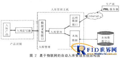 入库管理就是对进入仓库的产品进行识别,并对产品进行分类、核对和登记,生成入库产品清单,记录产品的名称、分类、规格、入库时间、生产厂家、生产日期、数量等信息,并将这些信息更新到库存记录。这些工作准确性要求高、工作量大,人工作业强度和难度都十分巨大。因此,迫切需要能自动识别产品的技术和方法,以减轻管理人员的工作量,提高工作效率。入库管理的关键在于对产品的识别和产品信息的采集,电子标签以其独特的优点成为产品自动识别的关键技术,而物联网则为产品信息共享和互通提供了一个高效、快捷的网络平台。基于物联网的自动入库管理系统的基本原理就是以电子标签作为产品识别和信息采集的技术纽带,通过在仓库出入口设置读写器对产品进行自动识别,同时通过物联网获取产品的详细信息从而自动生成入库清单,以达到自动化入库管理的目的。基于物联网的自动入库管理系统的结构如图2所示。它由产品识别、入库管理、PML服务器和本地数据中心四大功能模块组成。它们的作用分别如下: