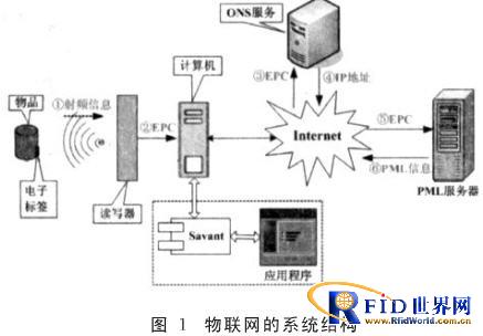 (4)应用管理系统。应用管理系统通过和信息采集软件(如Savant)之间的接口获取产品EPC信息,并通过ONS找到产品的PML信息服务器,从而获取产品详细信息以实现诸如入库管理、产品路径跟踪等应用功能。