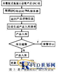 (1)产品识别。产品识别系统的核心是产品的编码和识别。在基于电子标签的入库管理系统采用EPC码作为产品的唯一标识码,EPC码是Auto―ID研究中心提出的应用于电子标签的编码规范,它使全球所有的商品都具有唯一的标识,其最大特色就是可以进行单品识别。产品识别系统包括电子标签和读写器。每个产品都附有一个电子标签,电子标签内写有EPC码作为产品的唯一编码。存储有EPC码的电子标签在经过读写器的感应区域时,EPC码会自动被读写器捕获,从而实现自动化的产品识别和EPC信息采集。入库读写器设置在仓库人口,对进入仓库的产品进行自动识别,并将捕获的产品EPC码通过数据采集接口传送到入库管理模块作相应处理。(2)入库管理。入库管理模块是系统的核心功能模块,它通过数据采集接口、远程数据接口和本地数据接口三个接口同其它几个功能模块进行交互,从而实现产品自动入库管理的功能。入库管理的作业流程图3所示:产品入库时,由设置在仓库人口的入库读写器读取产品的EPC码并通过数据采集接口交由入库管理模块,入库管理模块通过远程数据接口访问PML服务器以获取产品的详细信息,并自动生成产品入库清单,然后通过本地数据接口将入库产品信息更新到本地数据中心。一般来说,入库单具有如下的信息结构:入库单(产品EPC码、产品名称、生产厂商、产品分类名、单位、生产日期、有效期、入库时间、产品说明),在这一信息结构中,产品EPC码由入库读写器自动识别,同时记录产品的入库时间,其它的产品信息则可以根据产品的EPC码通过访问PML服务器获取,整个入库清单的生成都是自动进行的,这不但提高了产品入库的自动化水平和智能化水平,而且也确保了入库产品信息的准确性,为科学的库存管理与决策奠定了良好的基础。