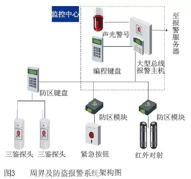 系统采用总线制构架,前端探测器通过总线模块接入报警主机,报警主机通过IP方式接入报警服务器,实现与视频监控系统的联动。系统构架如图3所示。