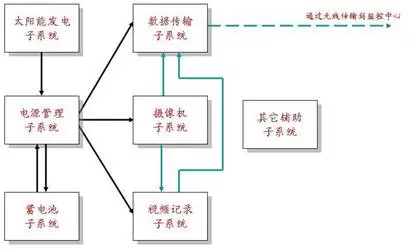 从系统架构图中可以看出,太阳能发电子系统、电源管理子系统和蓄电池子系统构成了整个系统的供电部份,而数据传输子系统、摄像机子系统、视频记录子系统则构成了整个系统的工作部份,其它辅助子系统指的是相关可选的功能,例如现场检测、控制、照明、入侵侦测、机械支撑部件等。