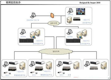 在充分了解行业客户需求基础上,顺应安防监控的发展特点和发展趋势,浪潮存储专门针对安防监控行业制定了一套解决方案。展览馆作为人群和物资密集型的场所,对监控防范环节提出了较高的要求,下面就以典型的展览馆监控布署为例,浪潮在方案设计中将整个展览馆的监控体系分为三级体系,展览馆为第一级信息监控平台,2个展区(西区和东区)作为第二级信息监控平台,旗下各个场馆(A馆、B馆和C馆)及其他场所作为第三级信息监控平台。整个视频数据的存储采用分布式集中存储的方式,前端由负责视频采集,视频数据的上传等,采集后的视频经过监控专网传输到二级信息监控中心,并进行集中存储,总信息平台进行集中控制和管理。