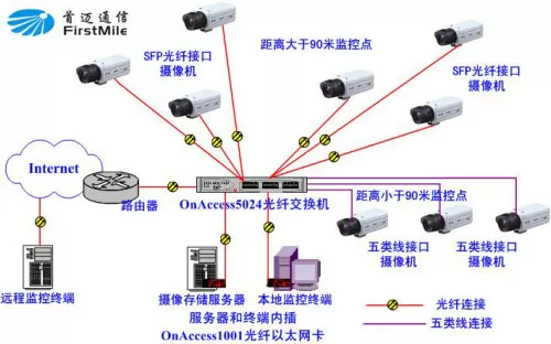 如下图是首迈通信OnAccess的光纤视频监控网络解决方案组网示意图。其完全基于视频数字化和以太网传输。它可以部分或全部以光纤作为传输媒介,克服了目前监控网络结构复杂、机房或交换机分散的缺点。网络结构中,交换机采用OnAccess5024,其光纤接口和电接口可以灵活配置。