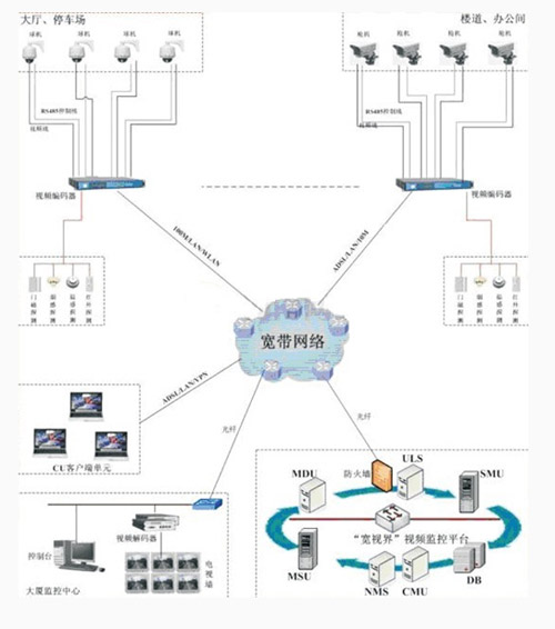 如下图所示,本监控方案在大厦走廊、大厅设置摄像头对图像进行采集,编码器连接到摄像头上,对摄像头进行控制,同时将摄像头采集的模拟信号或数字信号上传到联通宽带网上。由于大厦的监控点分布密集,可采用光纤的接入方式接入互联网。视频码流经过监控平台转发,通过互联网传输到监控中心。